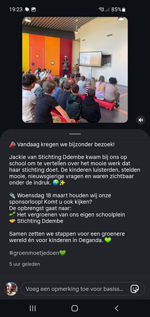Op 18 maart 2026 organiseert de school een sponsoractie voor Stichting Ddembe én voor het vergroenen van onze school.