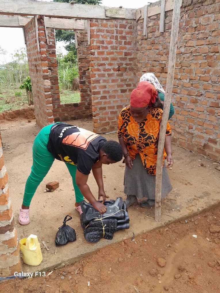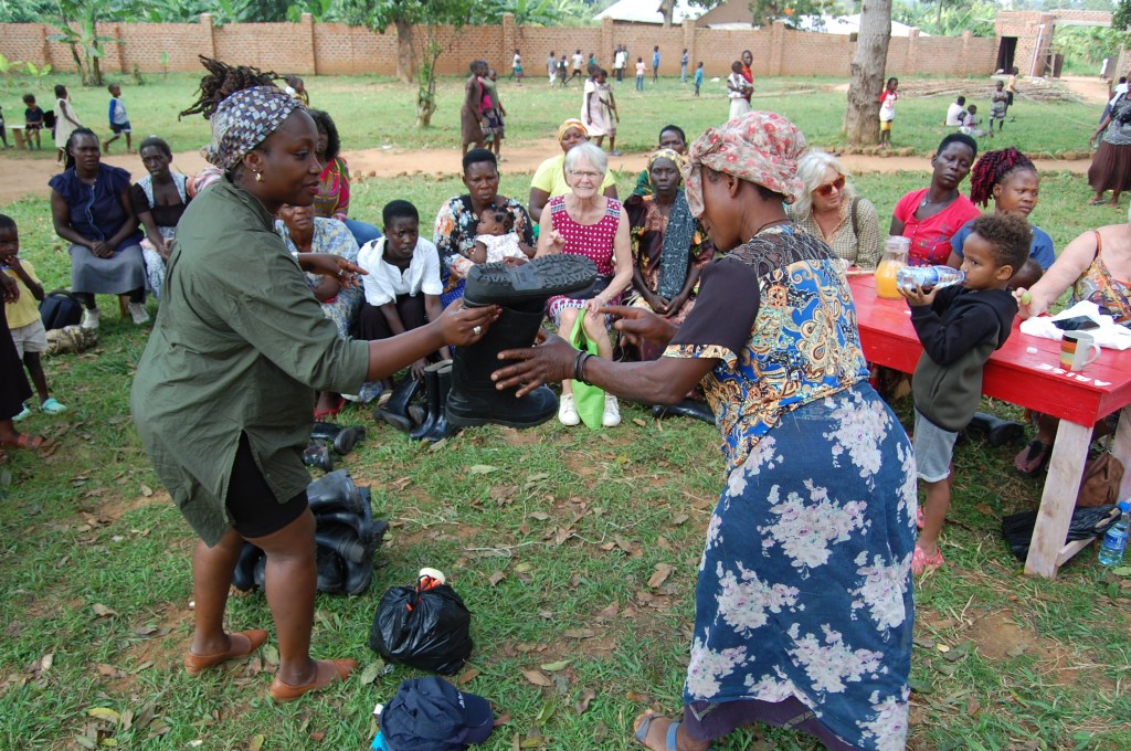 Voorzitter Jackie deelde handschoenen (links) en regenlaarzen (rechts) uit aan de vrouwen. Nu kunnen zij makkelijker en veiliger het werk op het land verrichten!