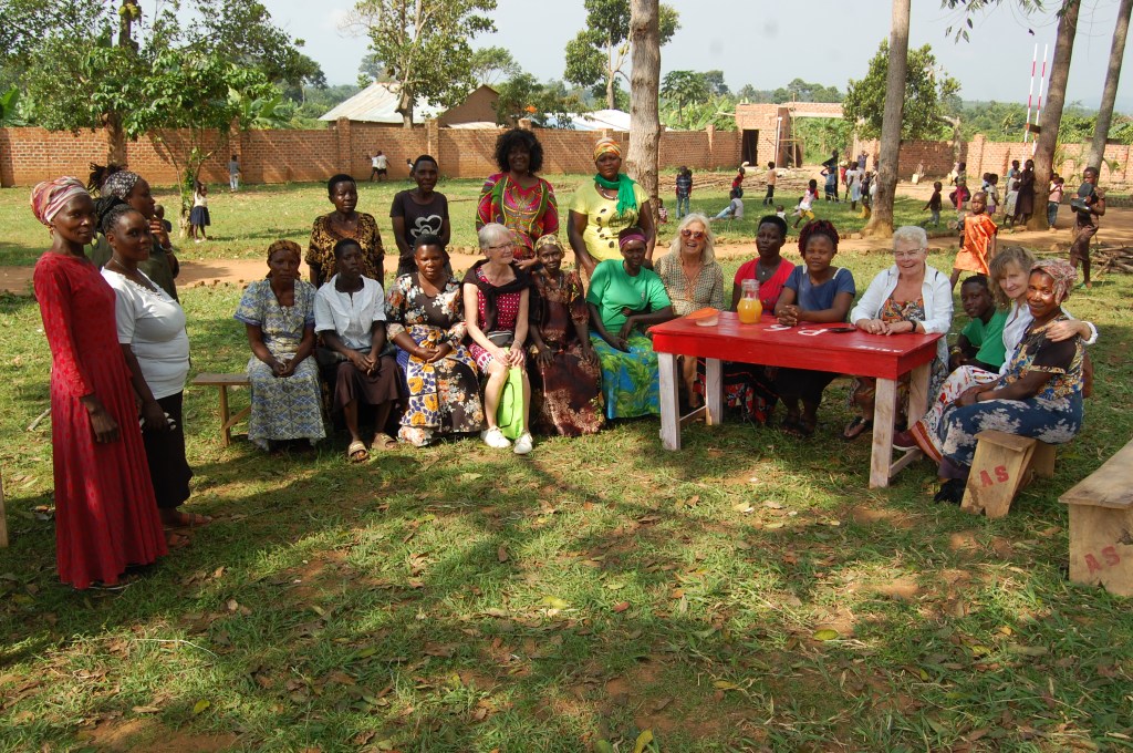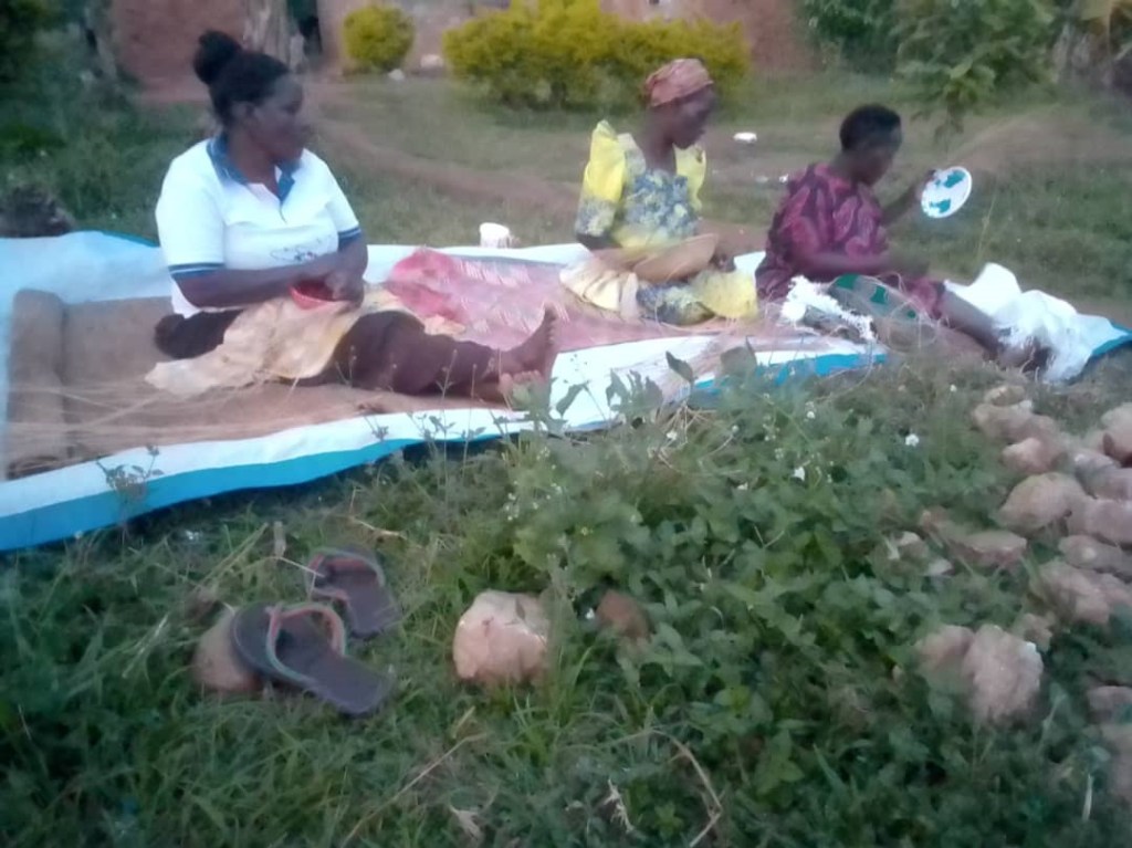 Op 1 oktober 2022 volgde de vrouwengroep op het schiereiland Bunjjako een workshop in het maken van deurmatten. De docente was door Ddembe betaald. Deze foto werd aan het begin van de workshop genomen, voordat de dames naar binnen gingen om daadwerkelijk matten te maken.