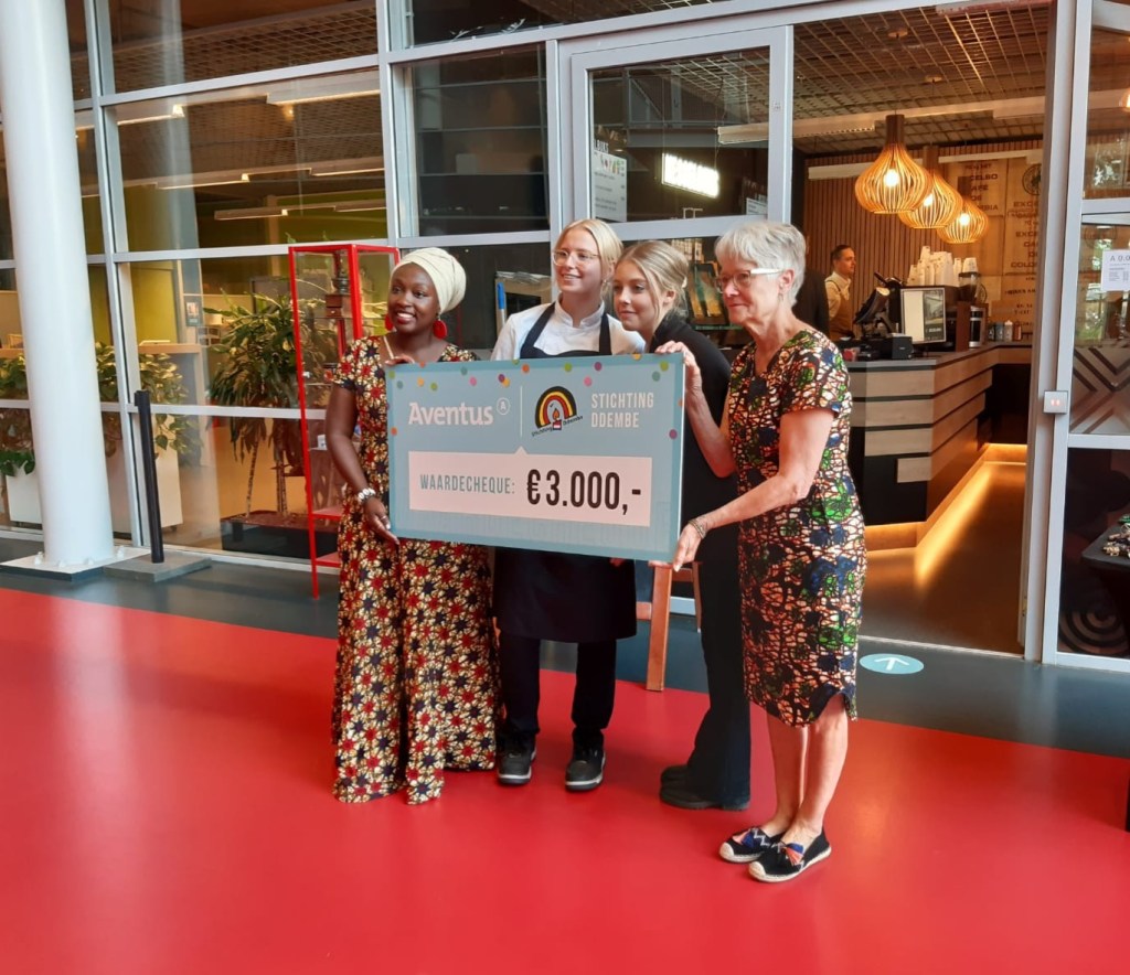Hoera! Op 21 juni 2023 nam Ddembe een cheque van drieduizend euro in ontvangst van Aventus, een mbo-school in Apeldoorn! Veel dank voor deze fantastische opbrengst, Aventus! Uiterst links zie je voorzitter Jackie Namakula; uiterst rechts secretaris/penningmeester Trees Snijder.