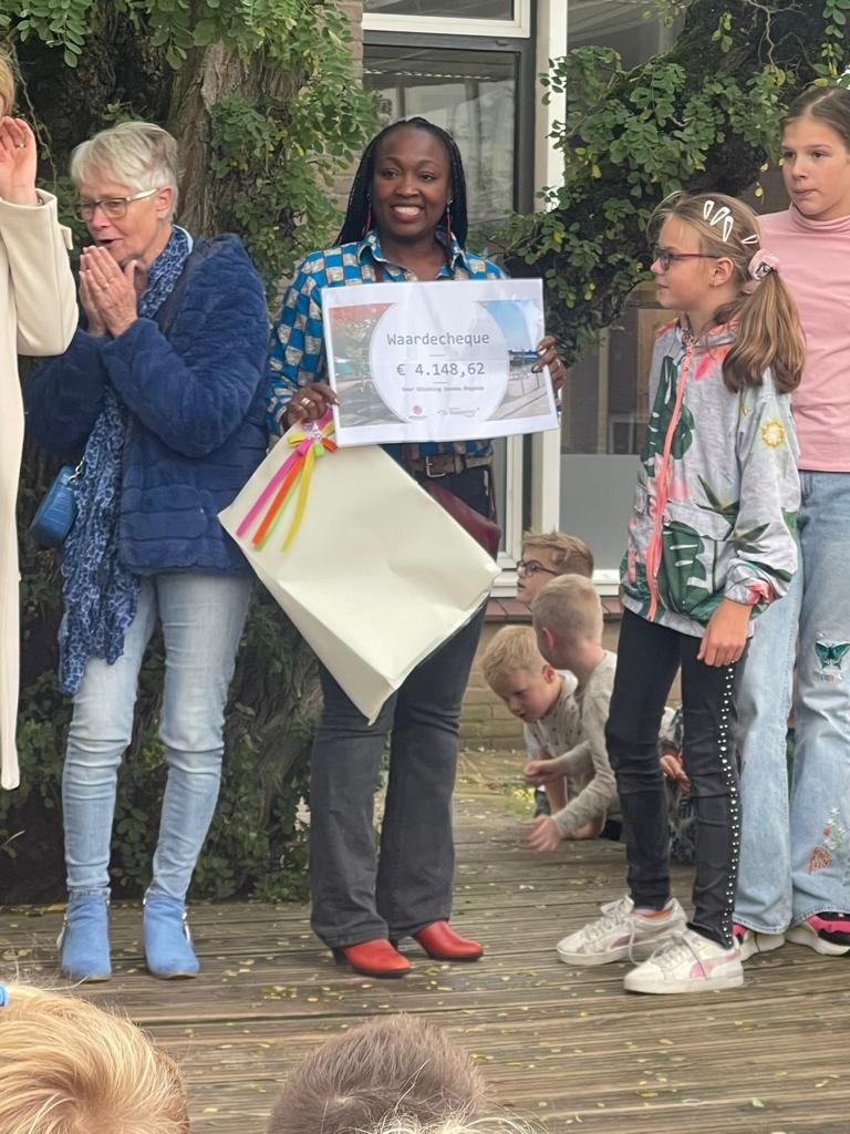 Op 13 oktober 2023 namen voorzitter Jackie Namakula (links) en secretaris/penningmeester Trees Snijder (rechts) de cheque van basisschool De Trompetter in Angerlo in ontvangst. De opbrengst van de sponsorloop was ruim vierduizend euro! Wauw, wat ontzettend goed gedaan zeg!!!