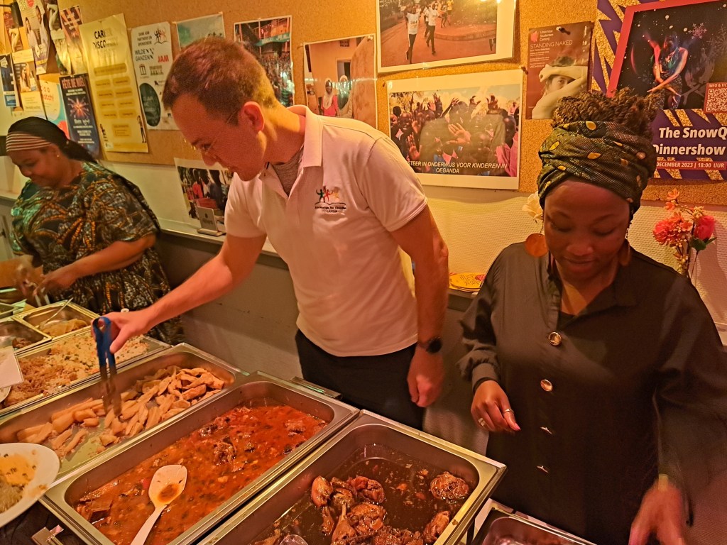 Op 25 november 2023 vierde Knowledge for Children (K4C), een stichting die zich inzet voor onderwijs in Oeganda, haar tienjarig bestaan in Utrecht. Ddembe verzorgde de catering voor ongeveer zeventig personen. Het was wederom een groot succes! Op de rechterfoto zie je directeur Ties Obers van K4C (midden) en voorzitter Jackie van Ddembe (rechts) in actie!