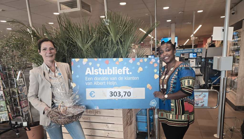 Wat was de statiegeldactie bij Albert Heijn (AH) in Duiven een groot succes, bijna driehonderd euro opgehaald! Op 6 maart 2024 nam voorzitter Jackie de cheque in ontvangst. Veel dank aan AH en iedereen die statiegeld heeft gedoneerd aan Stichting Ddembe!